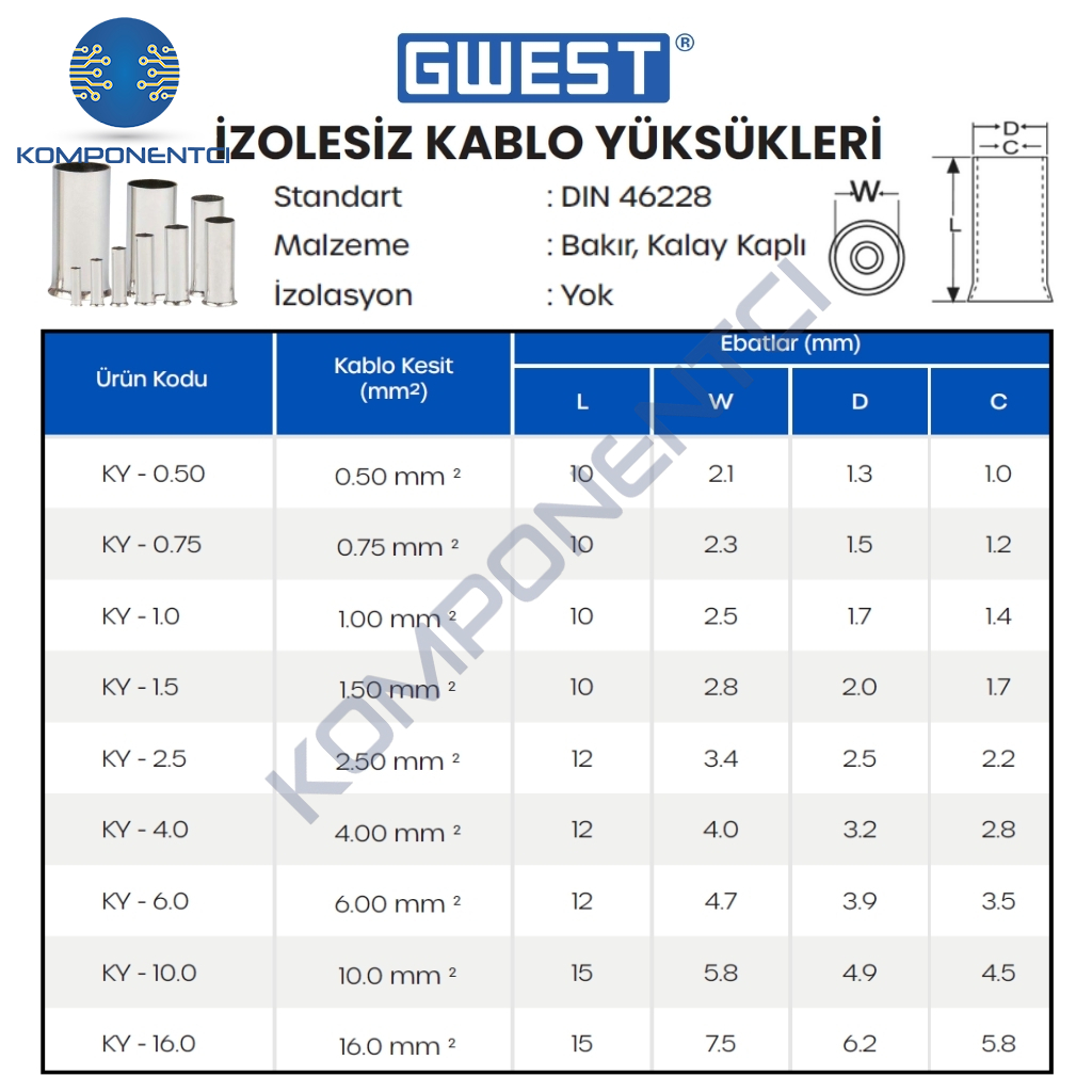 1 adet Gwest İzolesiz Kablo Yüksüğü KY-1.5 1000 Adet