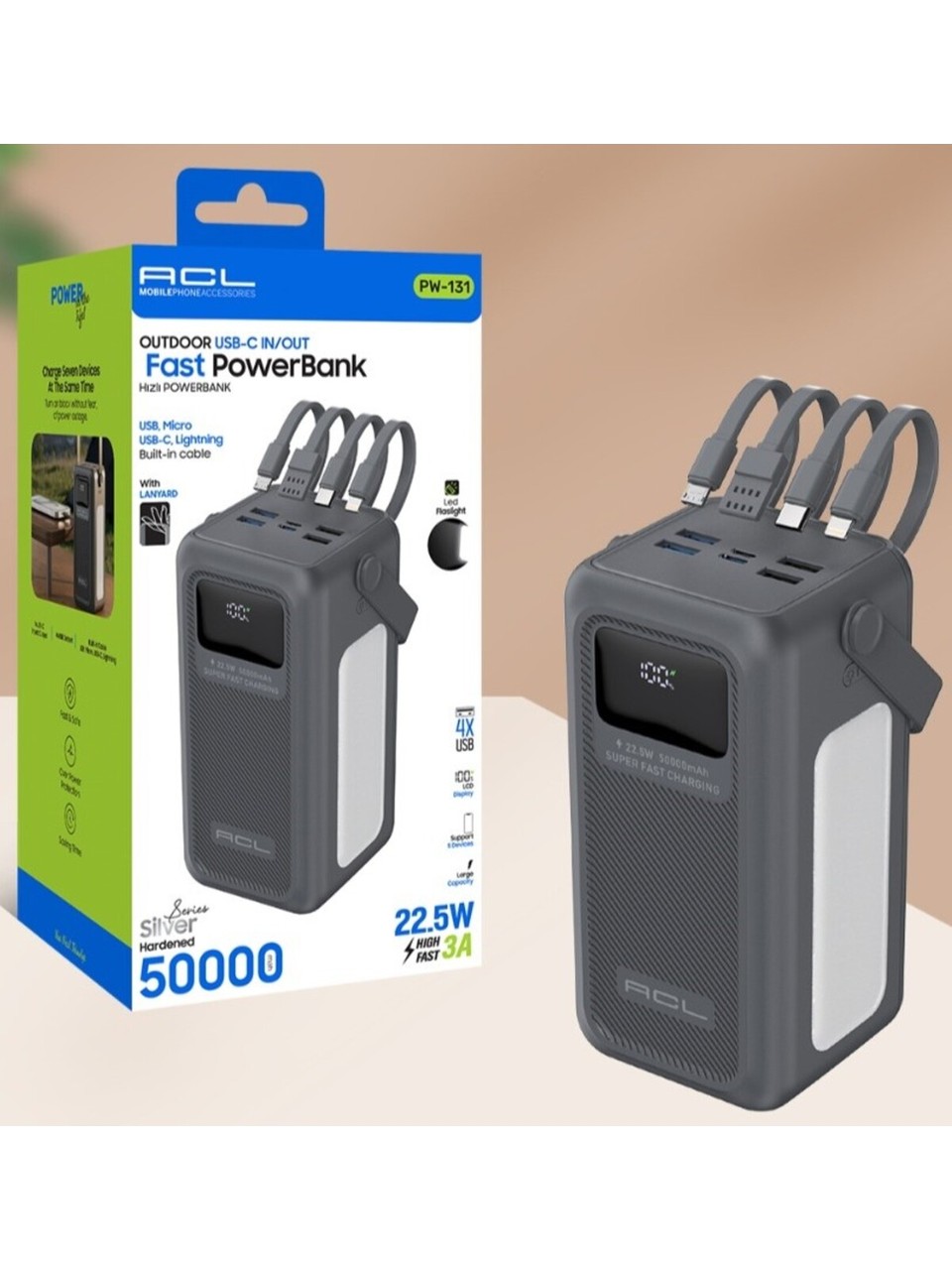 PW-131 Led Fenerli Dahili Kablolu 22.5W Hızlı Şarjlı Powerbank 50.000mAh