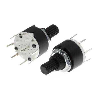 SR16 16mm 7 Konumlu Rotary Switch - Komitatör. 16mm çapa sahip, 7 konumlu bir nevi ayarlanabilir potansiyometredir.Birden çok farklı devreyi kontrol etmede kullanılır.